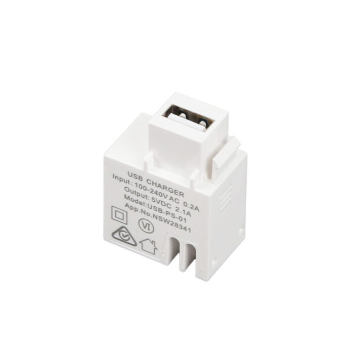 This USB charger module connects directly to mains power (240V AC) and provides 5V 2.1A USB A or C output. Perfect for in-wall powering of the SimpliDock range of iPad in-wall mounts.